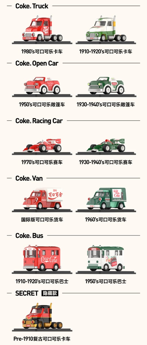 Mô hình đồ chơi Blind box Popcar CocaCola Classic Vehicles của POP MART mang đến một sự kết hợp độc đáo giữa nghệ thuật mô hình và biểu tượng văn hóa nổi tiếng toàn cầu – CocaCola. Bộ sưu tập này tái hiện lại những chiếc xe cổ điển, mang dấu ấn thời gian, gắn liền với hình ảnh của thương hiệu CocaCola. Mỗi chiếc xe được chế tác tỉ mỉ với thiết kế chi tiết, gợi nhớ về những khoảnh khắc lịch sử mà thương hiệu này đã đi qua.